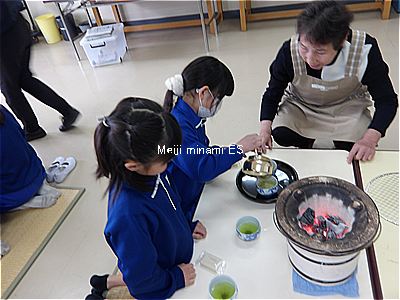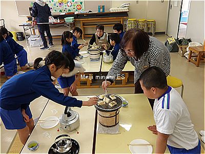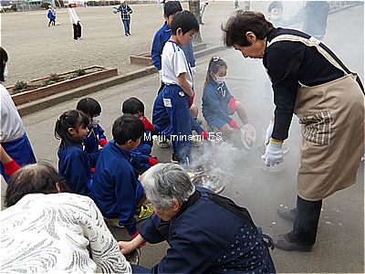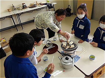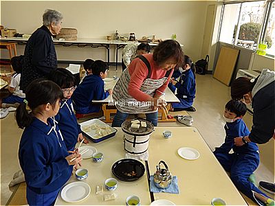 七輪でお湯を沸かしてお茶を飲んだり、おもちを焼いて食べたりしました。