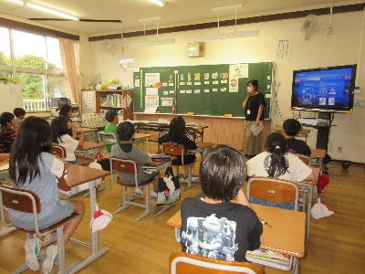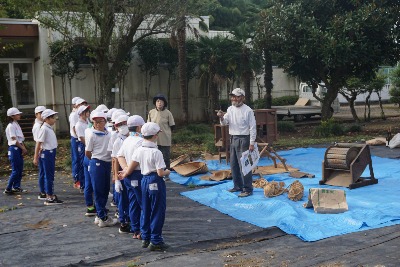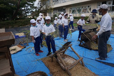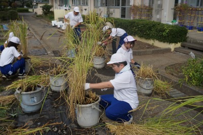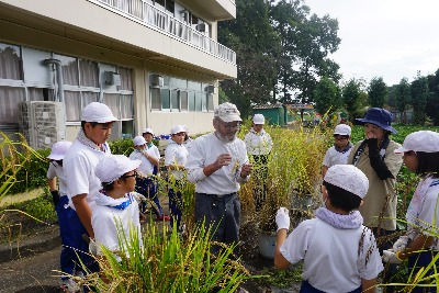 5年生の総合的な学習の時間にバケツ稲の稲刈りを行いました。はじめに地域の「お米の先生」からお話を聞きました。