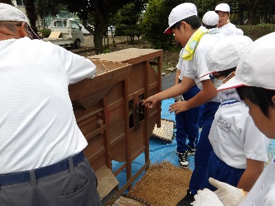 「唐箕」という昔の機械で、風の力を使って米とゴミに分ける体験もしました。