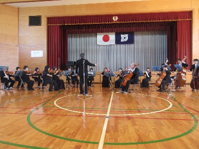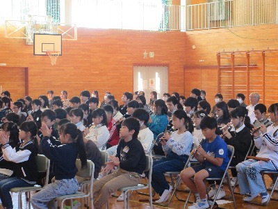 第2部のアトラクションとして、アンサンブル・ジュウィールの方々による音楽鑑賞会がありました。楽団の方々の演奏に合わせて子どもたちがリコーダーで参加したり、歌ったりしました。最後は、楽団の演奏で歌う校歌が会場に響き渡り、とても素晴らしい時間になりました。