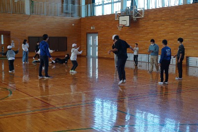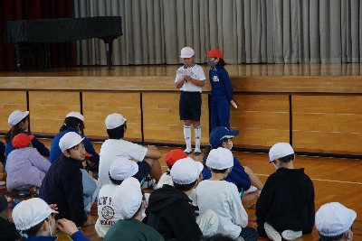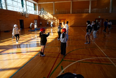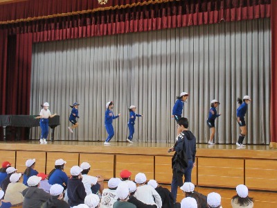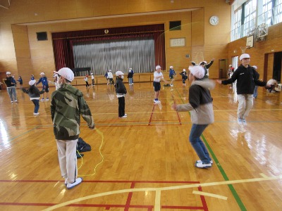今週は縄跳び頑張り週間です。今日は6年生が見本となり、様々な縄跳びの跳び方を披露し、その後縦割り班ごとに練習をしました。