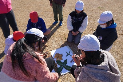 縦割り班によるたんけん活動を行いました。今日は、落ち葉や木の実を使って、画板に作品を製作しました。