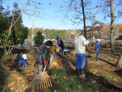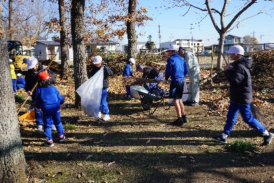 坂小応援団の方々のお力をお借りして、落ち葉拾いを行いました。