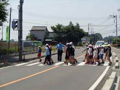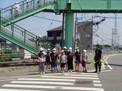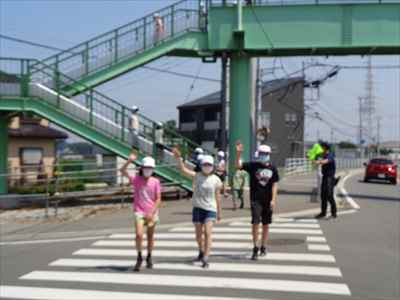 横断する際には、手を挙げて→右見て→左見て→右見て→横断→お礼 という流れを確認しました。子供たちは、普段から登下校時に実施しています。