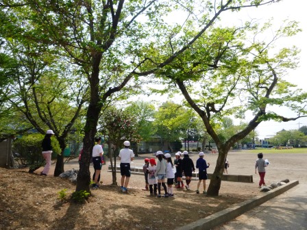 縦割り班ごとに分かれ,1年間調べていく樹木を決めました。クヌギやハナミズキなどが選ばれました。刻々と変わる樹木の様子を,楽しく観察していきたいと思います。