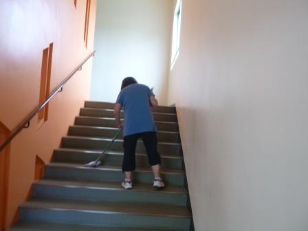 子どもたちが下校した後、職員が階段のワックスがけをしました。