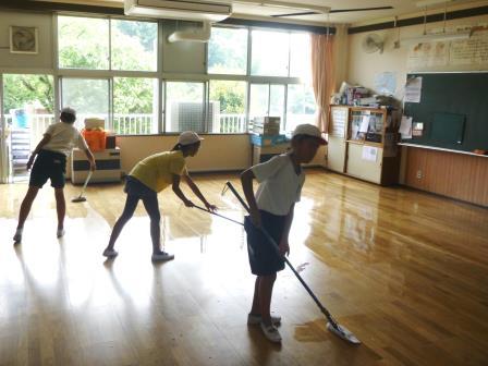 もうすぐ夏休みです。今日は全校生で大掃除を行い、5・6年生が教室等のワックスがけをしました。