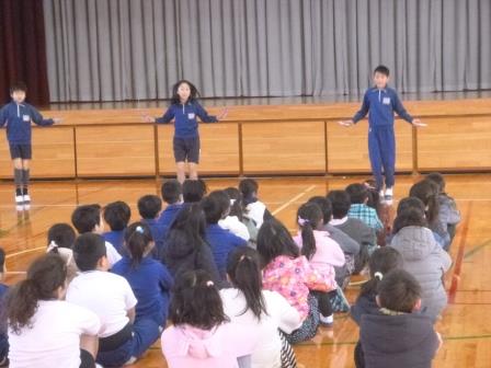 全身持久力や調整力の向上を図り、最後まで頑張りぬく力を育てるため、なわとび検定を実施します。子どもたちは「なわとび検定練習カード」をもとに練習に励んでいます。とべた種目や回数によって、15級~1級、特級、さらに“名人”に認定されます。今日は、体育委員会の児童や代表児童が15級~1級の種目「①前とび、②後ろとび、③前かけ足とび、④後ろかけ足とび、⑤前あやとび、⑥後ろあやとび、⑦前交差とび、⑧後ろ交差とび、⑨二重とび、⑩後ろ二重とび、⑪前あや二重とび、⑫後ろあや二重とび、⑬前三重とび、⑭稲妻とび(前二重とび・前あや二重とび・前交差二重とびの連続技)」を実際にとんで見せてくれました。みんなとても上手にとんでいました。