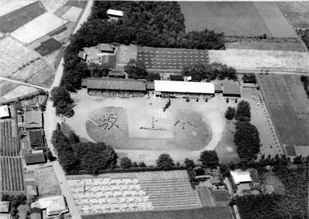 ちなみに、昭和36年の全景です。木造校舎で建っている場所も違います。体育館やプールはまだありません。現在とはずいぶん違っていますね。