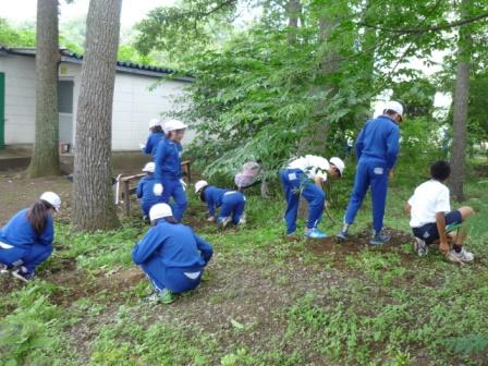 今日は、みどり活動の日です。全校生でなかよしの森の除草を行いました。なかよしの森は、思ったよりも涼しくて、多くの雑草が生えていました。みんなで分担して、雑草をきれいに取りました。虫やトカゲなど、たくさんの生き物が見られました。