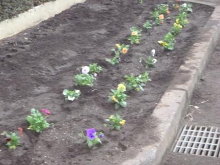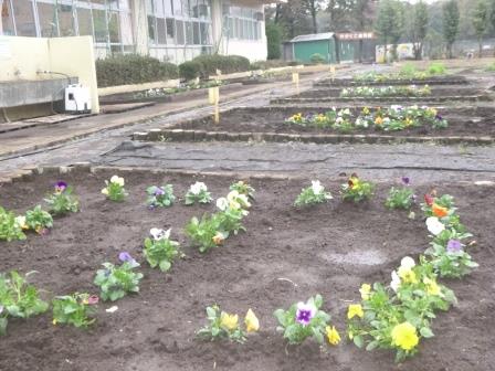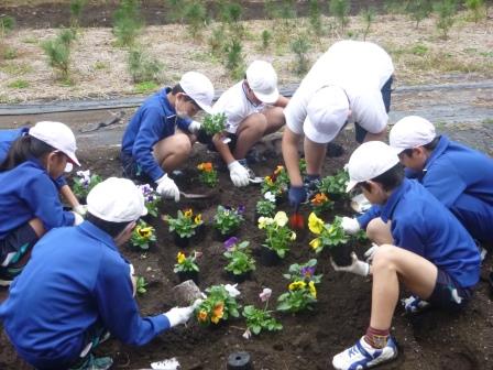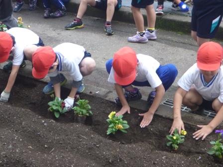 各学年ごとに、思い思いの植え方でパンジーを植えました。