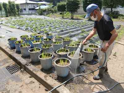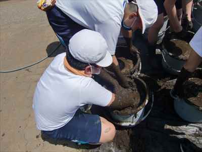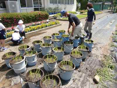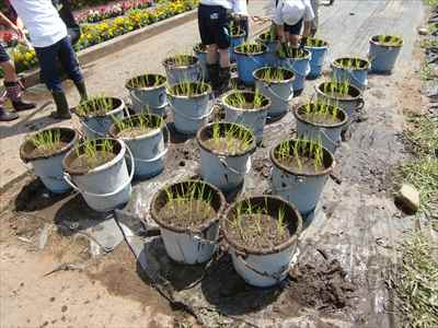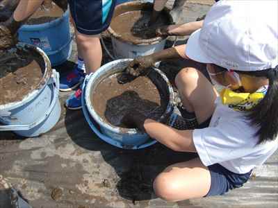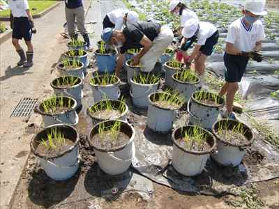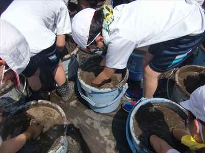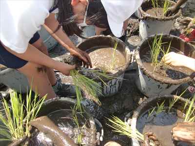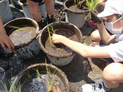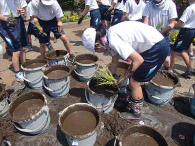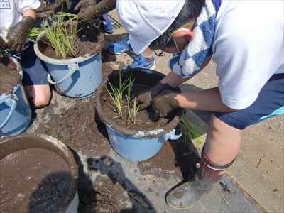 子供たちは、バケツを使って稲を育てていきます。雑草対策や水もちをよくするため、両手で代掻きを行っています。