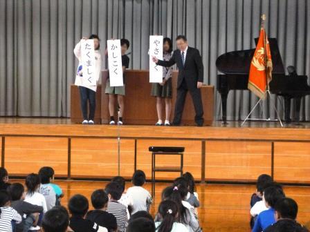 校長先生が本校の目指す児童像「やさしく かしこく たくましく」について話しました。