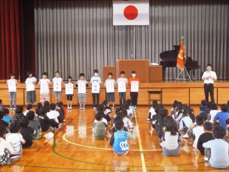 1・3・5年生の代表児童が1学期の反省や頑張ったことを発表しました。