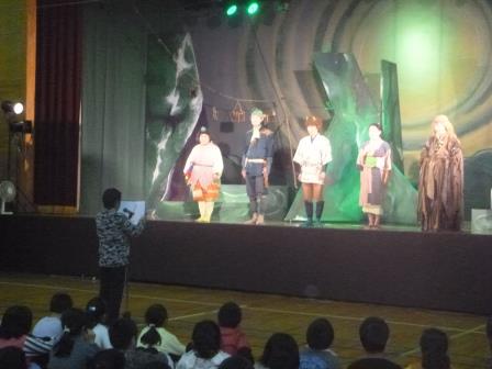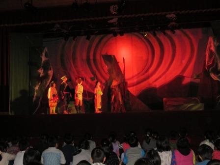 生の演劇に触れ、豊かな情操を養うことをねらって、演劇鑑賞教室を実施しました。全校生で体育館に集まり、劇団「らくりん座」による「ゆきと鬼んべ」を鑑賞しました。友情や勇気、思いやり、親子の情愛など、多くのことを考えさせてくれるすばらしい劇でした。