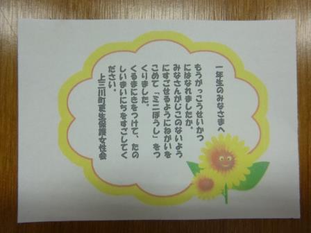 「1年生のみなさまへ くるまにきをつけて、たのしいまいにちをすごしてください。」一人一人に手紙もいっしょについています。