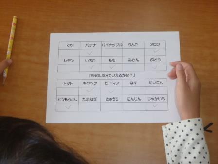 買えた野菜や果物は、プリントにチェックします。たくさん買えたかな?