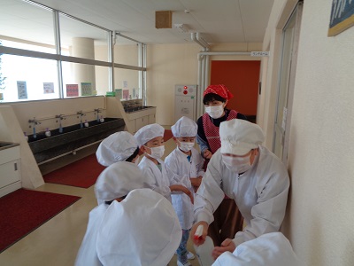 給食当番さんも張り切って準備できました。まずは配膳員さんから消毒をしてもらいます。