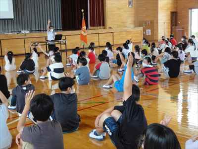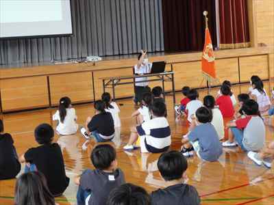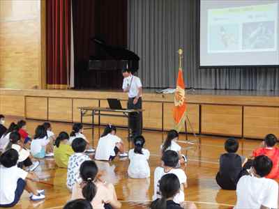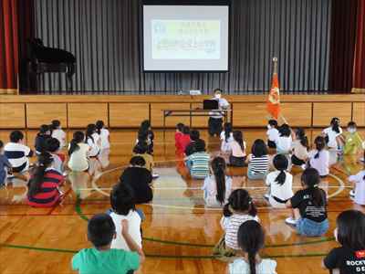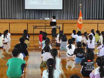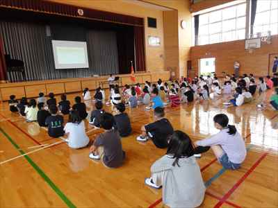 本校の誕生は1875(明治8)年6月12日で、今から146年前です。校長先生が「写真でみる坂上小の今昔」をテーマに、昔の運動会や行事などの写真を提示しながら話をしました。子供たちは校長先生の話に反応したり、質問に答えたりしながら、和やかな雰囲気で集会が行われました。その後、県民の日についても話がありました。