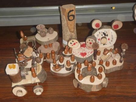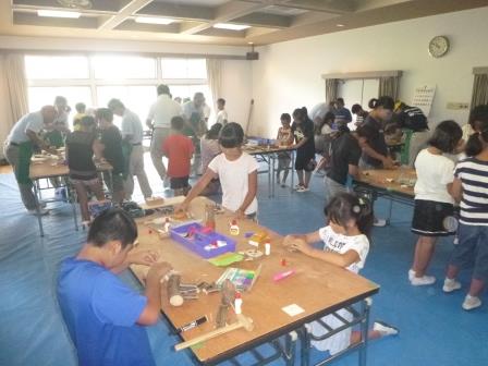 坂上コミュニティセンターを会場に、坂上地区放課後子ども教室のイベント「環境わごん」が開催されました。自然の木を使って、子どもたちは、指導者の先生方に助けていただきながら、思い思いに工夫を凝らした作品を作っていました。