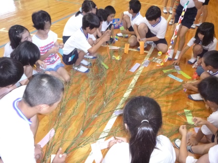 児童会主催による七夕集会が行われました。それぞれが書いておいた短冊を,願いを込めて竹につるしました。みんな,どんな願いを書いたのかな?