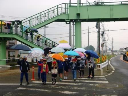 小雨の中,交通安全教室が行われました。下野警察署の方から,交通安全についての講話をいただき,正しい横断歩道の渡り方を教えてもらいました。みんな,真剣な表情で取り組んでいました。