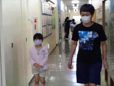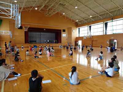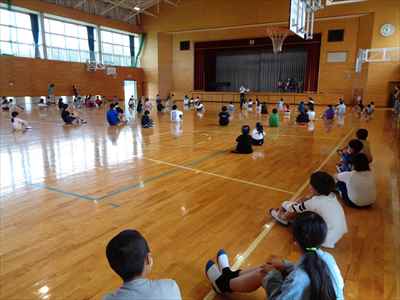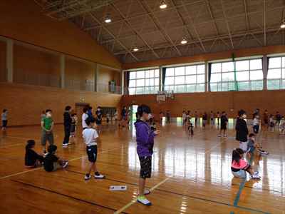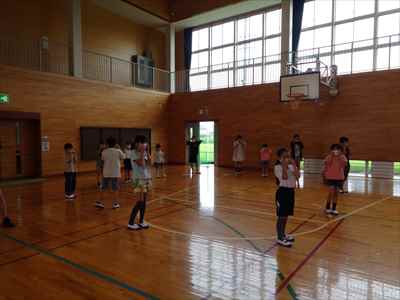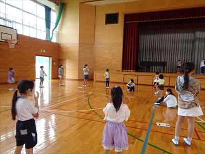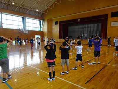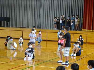 代表委員の児童がゲーム「サイモンセッズ」を説明した後、全児童で行いました。