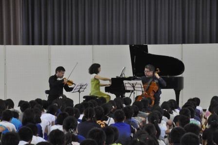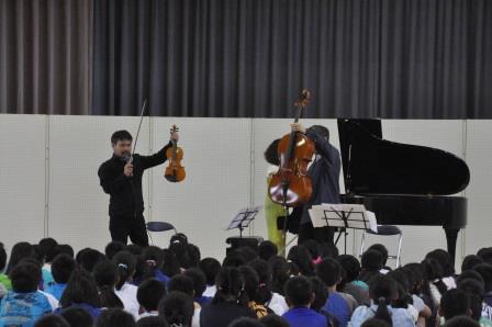 上三川小学校体育館で開催された移動音楽鑑賞教室に4・5・6年生が参加し、ヴァイオリン・チェロ・ピアノのコンサートを楽しみました。優れた音楽を直接鑑賞できる貴重な機会となりました。