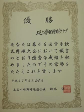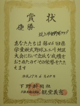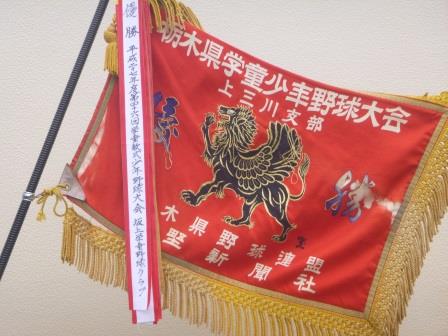 第46回県学童軟式野球上三川地区大会において、坂上学童野球クラブが見事優勝し、深紅の優勝旗を手にしました。日頃の練習の成果が実を結んだものと思います。おめでとうございます。
