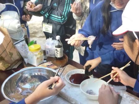 つきあがった餅は、きな粉・のり・しょうゆ・あんこなど好きなものを付けて、みんなで食べました。おいしかったですね。