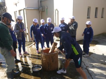 坂上コミュニティセンターから臼と杵をお借りして、子どもたち全員が本格的な餅つき体験をしました。