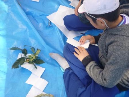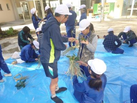 友達と助け合ってわらを編んでしめ縄を作りました。