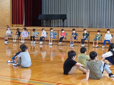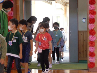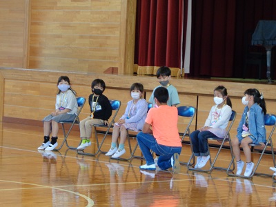 次は縦割り班ごとに、上級生が自己紹介です。