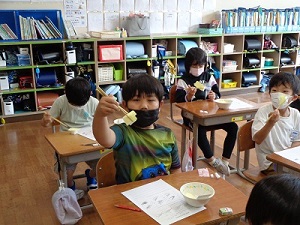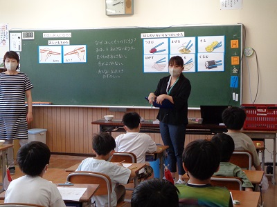 今日は給食センターから学校栄養士さんが来てくださり、2年生にお箸の持ち方・使い方を詳しく教えてくださいました。