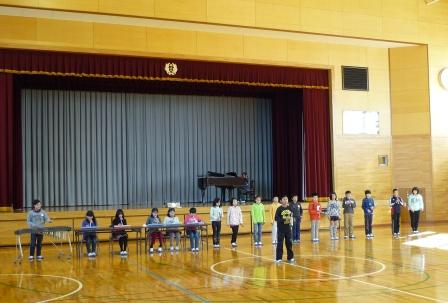 音楽集会が行われました。今回は、1・5年生の発表でした。1年生は、「さんぽ」「きらきら星」、5年生は、「マンボNo.5」「世界が一つになるまで」を演奏しました。最後は、全校児童で、「グッデ-グッバイ」を歌いました。寒い中でしたが、心が温まる集会になりました。