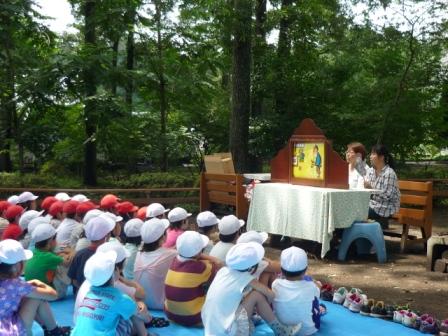 昨年に引き続き、なかよしの森で読み聞かせを行いました。図書ボランティアの皆さんに協力していただき、紙芝居「舌切り雀」を見ました。さわやかな風の中、楽しい読書会となりました。