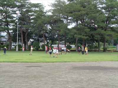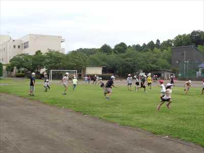 子供たちは、気持ちのよい天気のもとで、校庭一面を使って元気いっぱいに遊んでいました。