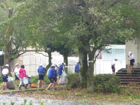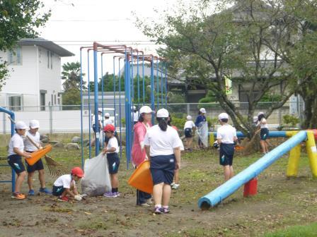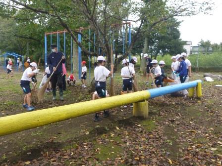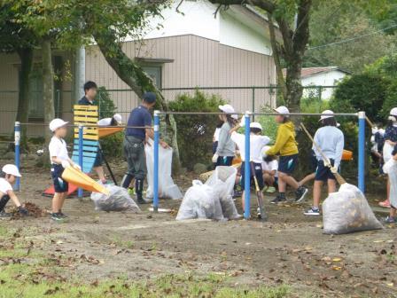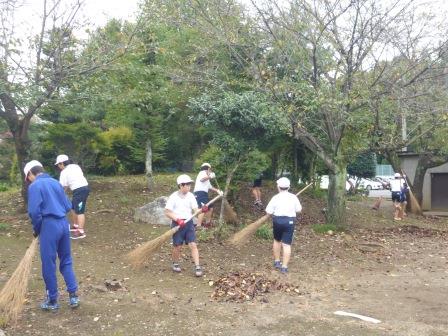緑豊かな本校には、学校林“なかよしの森”をはじめ、多くの樹木があります。今日のみどり活動は、全校生で落ち葉掃きをしました。上級生が竹ぼうきやくまでを使って集めた落ち葉を、下級生がてみを使って袋に入れました。みんな一生懸命に活動していました。本校児童は勤労の意識がとても高いと、いつも感心しています。