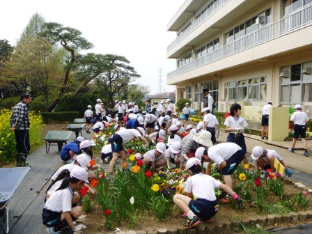 各学年に分かれて,学年花壇の除草をしました。坂上小では,このような環境緑化活動を年に20回以上行います。坂上小の豊かな自然は,こうした努力によって支えられています。