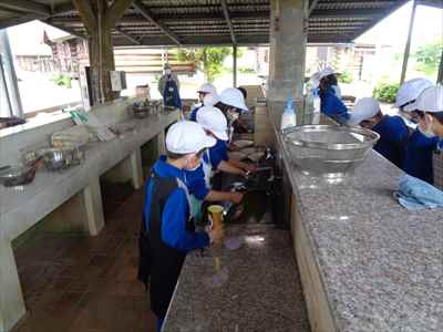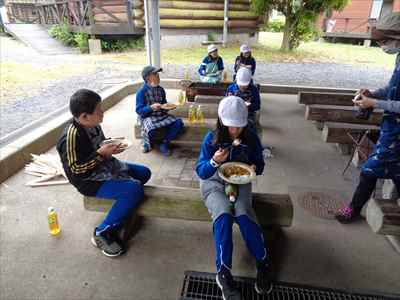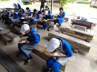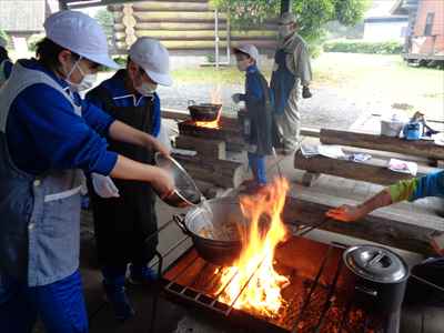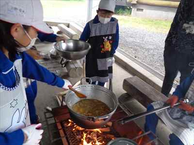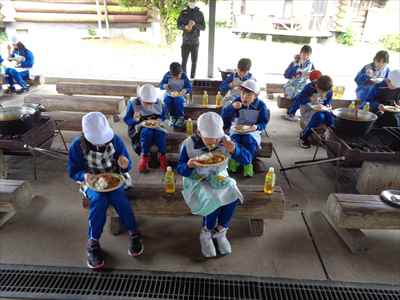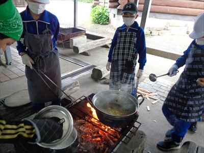 各班ごと、火を燃やす・米とぎ・材料切りなどの係活動を行っている様子ポークカレーのできあがりです。