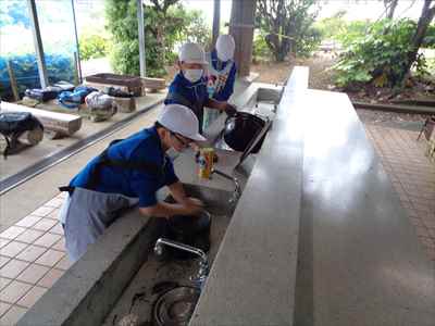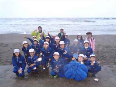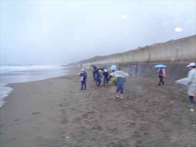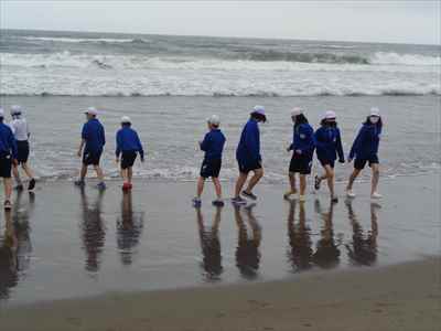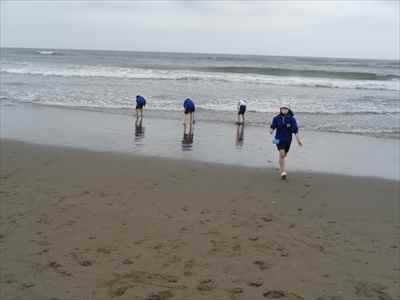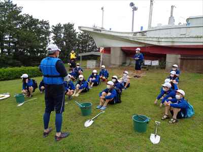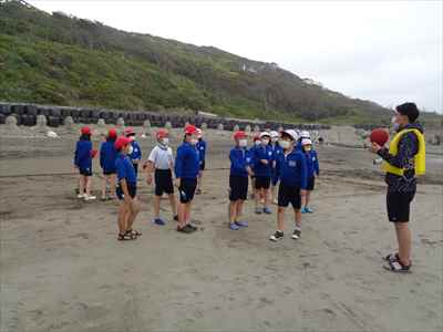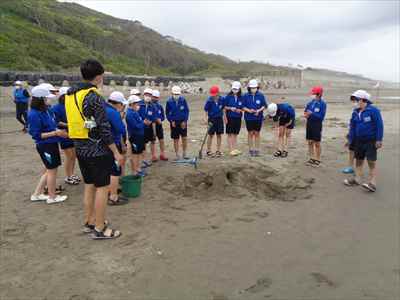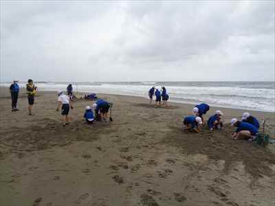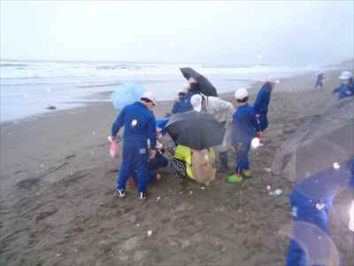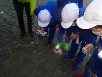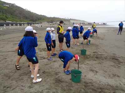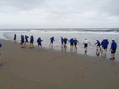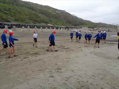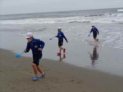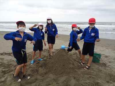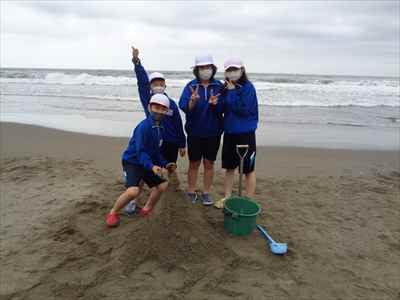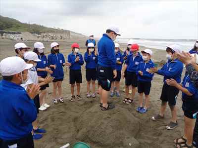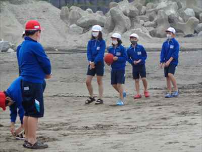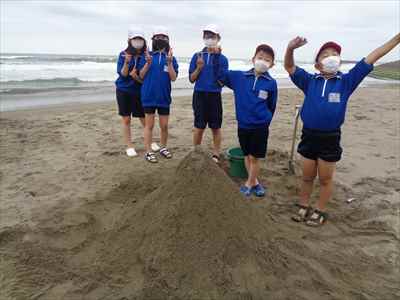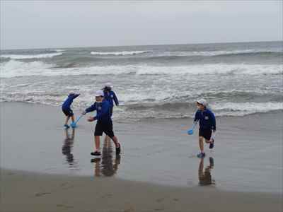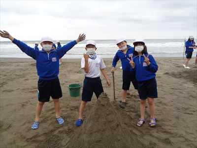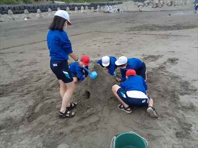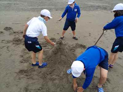 協力して後片付けをしている様子 午後は砂浜活動を行いました。波と鬼ごっこ潮くみリレードッジボール砂浜での創作活動