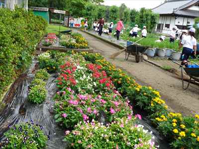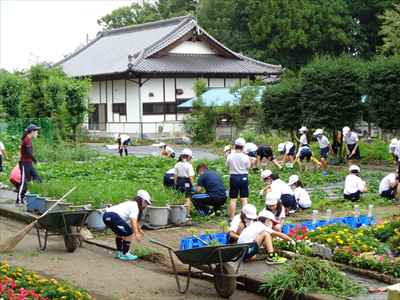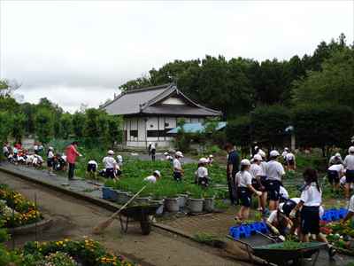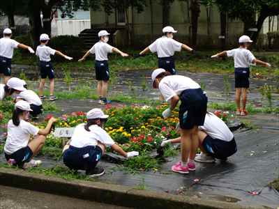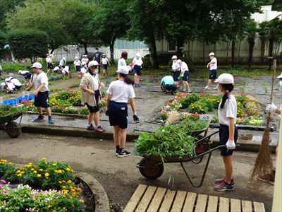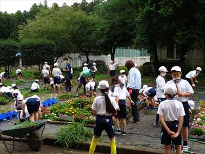 本校は豊かな自然に囲まれ、“緑と花と小鳥の学校” と呼ばれています。本校の特色として、勤労体験を重視したみどり活動の充実を図っています。今年度、はじめて全員で花壇の整備をしました。子供たちは、学年花壇・クロマツ畑・さつまいも畑周辺と、マルチや防草シートの隙間から生えている草を抜いていました。