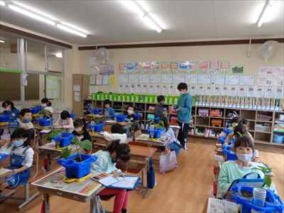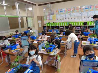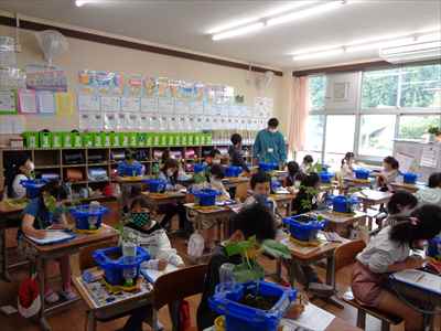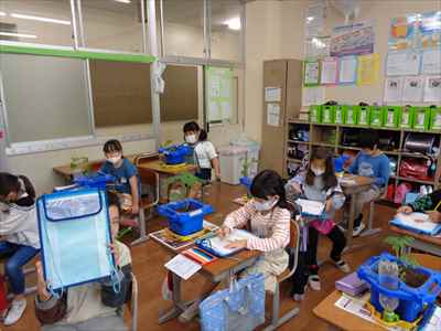 2年生が生活科の授業で野菜を育てています。自分が育てている野菜の様子や変化に関心をもち、じっくり観察したり、世話の仕方を工夫したりできるよう目指しています。