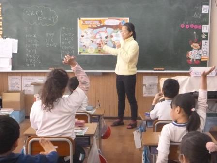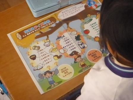 1年生が、町学校給食センターの学校栄養職員の先生をお招きして、食育の授業を行いました。いろいろな食べ物と栄養の関係について、プリントを使いながら学習しました。