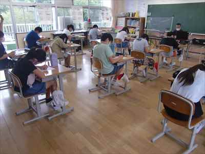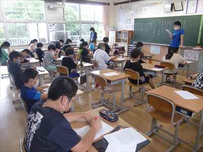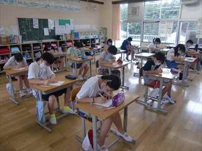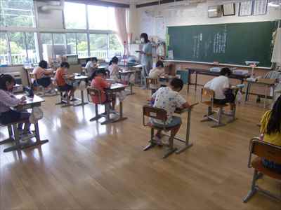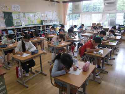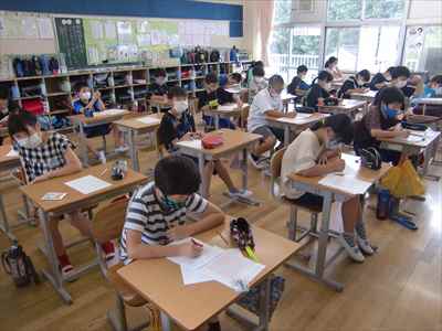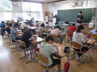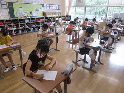 本校では、算数に対する興味・関心を高め、速く正確に計算しようとする意欲をもたせるために、百ます計算大会を実施しています。3年生以上の子どもたちを対象として年間4回行い、計算力の向上や、基礎・基本の定着を図ります。今回は、各教室でたし算を行いました。担任から行い方などの説明を聞いた後、一斉にスタートしました。