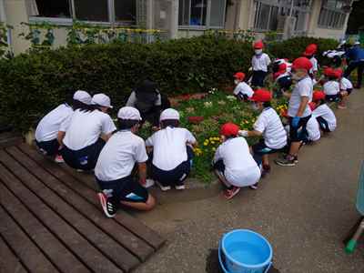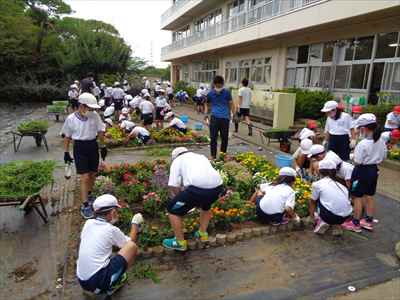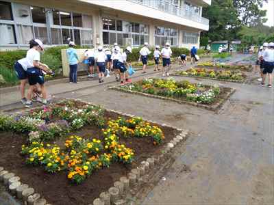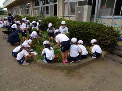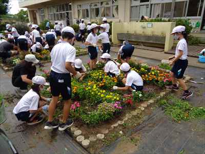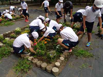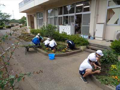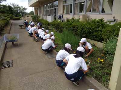 6月22日(火)、学校花壇の除草を行いました。本校は豊かな自然に囲まれ、“緑と花と小鳥の学校」と呼ばれています。本校の特色として、勤労体験を重視したみどり活動の充実を図っています。今回は、全員で花壇の整備をしました。