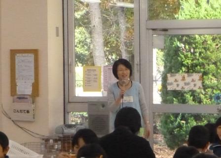 給食の時間に、町学校給食センターの栄養教諭の先生から、毎日の給食の残量や栄養についての話をお聞きしました。