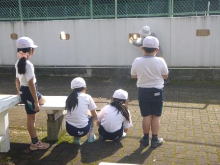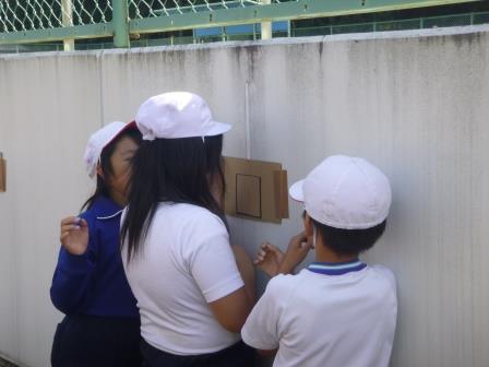 3年生が鏡を使って理科の実験をしました。鏡で日光を集め、明るさや温度の変化を調べました。