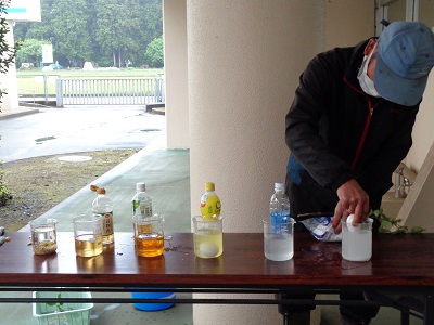 まずは、沈んでしまう生卵が塩水に入れると浮く実験からです。