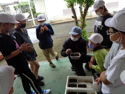 長一先生に教わりながら、いちごパックに土を入れもみを蒔きました。